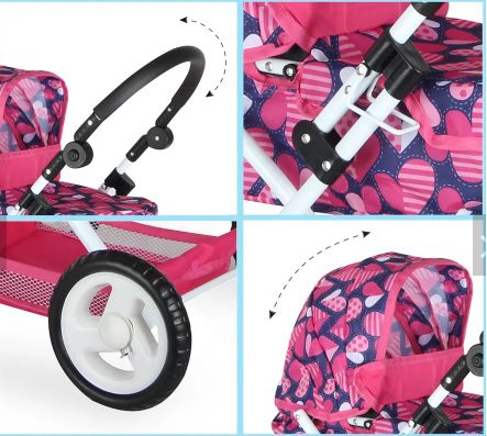 Čvrsti aluminijski okvir s luksuznom ružičastom tkaninom za moderan izgled i izdržljivost, lagana za vožnju! Ova kolica za lutke idealna su za igru ​​u stvarnom životu i savršena su za poticanje mašte i kreativnosti vašeg djeteta. Klasični oblik okvira i veliki kutni krov daju kolicima dašak retro-šika. Aktiviranjem malog klizača na okviru, kolica se lako mogu sklopiti za transport. Kolica imaju veliku košaru za kupovinu, mekanu ručku i gumene kotače za duge šetnje. Prostrana kolica za lutke: može stati bilo koja beba lutka, plišani medo ili omiljena plišana životinja do 43cm