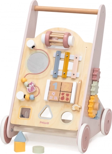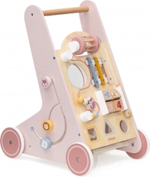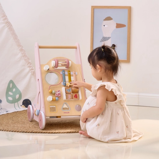 Ružičasta hodalica odličan je način za zabavu i učenje. Nudi interaktivne aktivnosti poput gledanja u ogledalo, okretanja blokova, kotrljanja zvečke, spajanja oblika i sviranja činela. Osim toga, straga se nalazi praktičan pretinac za pohranu , savršen za pohranu njihovih omiljenih igračaka.