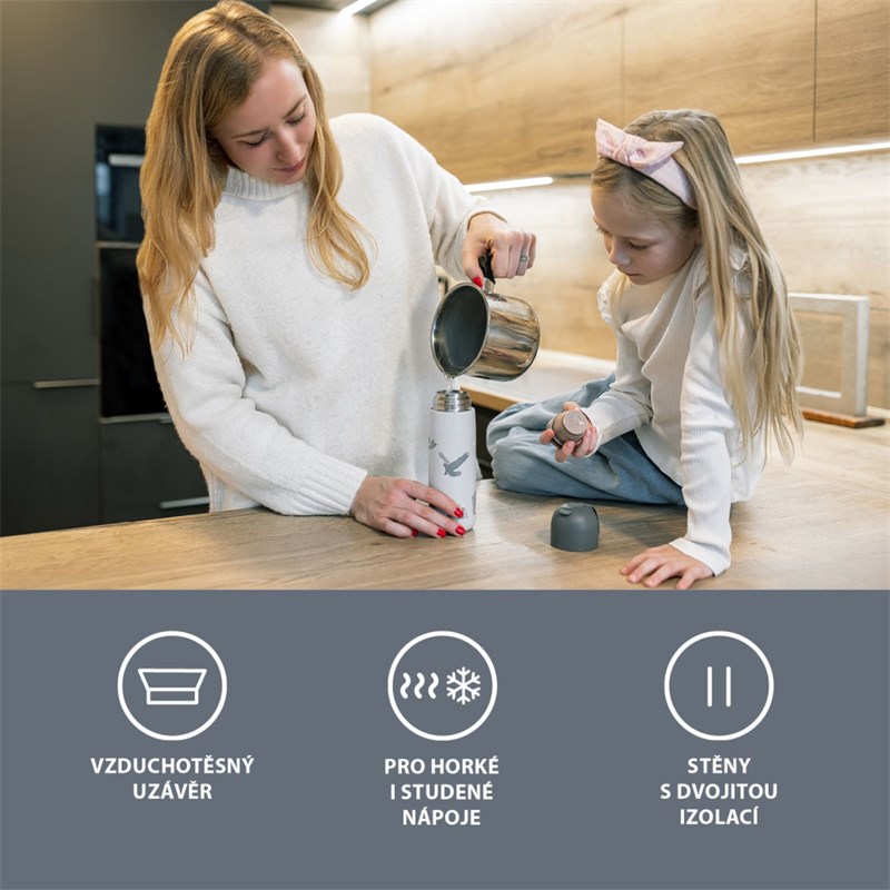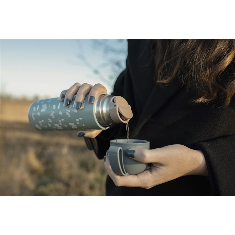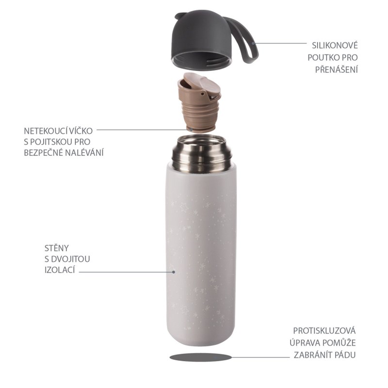 Drži tople i hladne napitke, kvalitetan nehrđajući čelik, otporan na koroziju i kondenzaciju, čvrsti čep, silikonski držač, volumen 400 ml - ovo je termos za tekućinu sa silikonskim držačem. Kvalitetna termosica za tekućinu zapremine 400 ml održava piće toplim do 12 sati, hladnim do 24 sata. Izrađena je od visokokvalitetnog nehrđajućeg čelika koji je otporan na koroziju. Čvrsti poklopac osigurava da termosica ne curi, a gornji čep za praktično točenje osigurava da sadržaj ne iscuri čak i kada vozite po neravnoj cesti, a također možete biti sigurni da dijete neće opeći tekućina iz termosice zbog dvostrukog čepa. Poklopac termosice može se koristiti kao šalica. Zahvaljujući vakuumskoj izolaciji, termosica se ne zagrijava izvana kada se puni vrućom tekućinom. Za udobno držanje, termosica je opremljena silikonskim držačem za čaše. Korištenjem termosica za tekućine pridonosite smanjenju potrošnje plastike. Termosicu perite ručno, nije prikladna za perilicu posuđa. • Zapremina 400 ml • Prikladno za hladne i tople napitke • Čvrsti čep koji sprječava curenje • Poklopac se može koristiti kao šalica • Kvalitetan nehrđajući čelik • Vakuumska izolacija • Silikonski držač • Protuklizno dno • Gornji poklopac za ulijevanje • Održava sadržaj toplim do 12 sati • Održava sadržaj hladnim do 24 sata • Bez BPA • ECO friendly