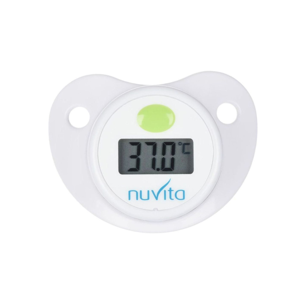 Kvalitetni toplomjer u obliku dude Nuvita. Omogućuje jednoistavno mjerenje temperature kod beba i male djece. Kada je temperatura izmjerena čuje se zvučni signal. Oscilacije mjerenja su 0,1`C. Gasi se jednostavnim zatvaranjem poklopca. Područje mjerenja: 32-43`C. Za bebu od rođenja.
