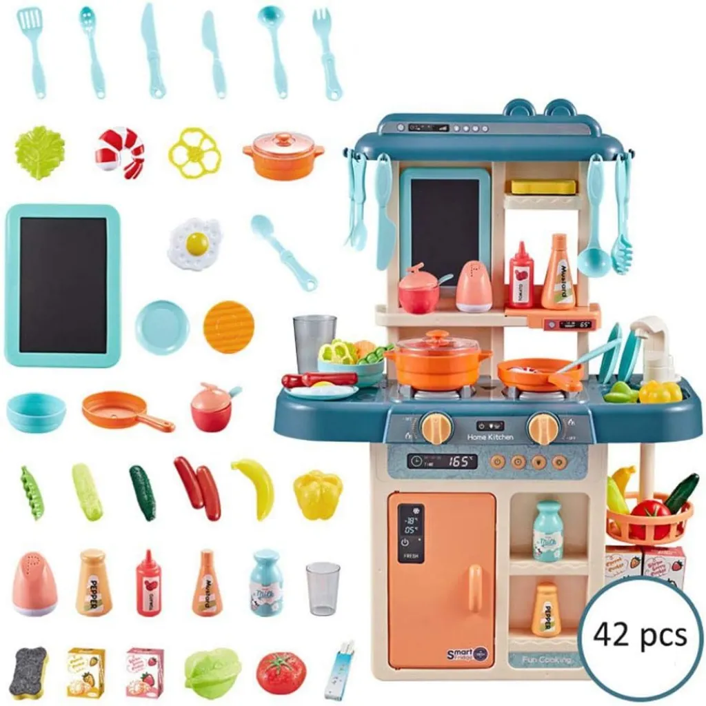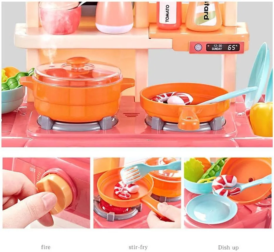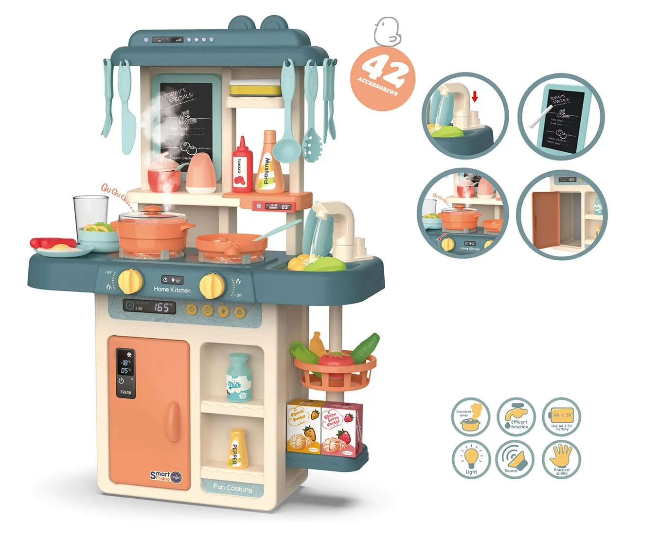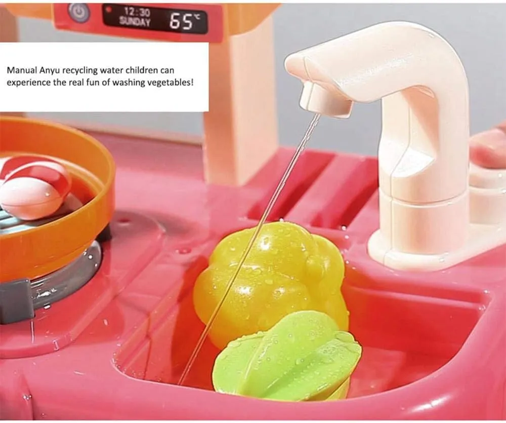 Ovaj kuhinjski set ima mnogo značajki; dječji kuhinjski set uključuje štednjak za igranje s realističnim svjetlom i zvukom, raspršivač pare za realističnu igru, sudoper za igranje s tekućom vodom, rotirajuću policu za desert i kuhinjske dodatke od 42 dijela, dodajući više zabave za pretvaranje! Napomena: Dimenzija proizvoda (D*Š*V): 63x22x45,4 cm Djeca će moći putem stvarne vode oprati posuđe, a putem preko 40 dodataka naučiti sve o priboru za jelo i namirnicama Kvalitetne i djeci prilagođene kuhinje za igru ​​za malu predškolsku djecu: visokokvalitetni materijali, bez mirisa; glatki rubovi, bez zveckanja, bez oštrih rubova na svakom priboru;