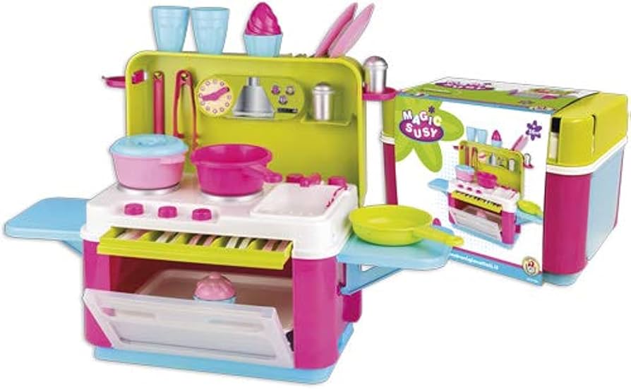 Putna kuhinja s dvije bočne, noseće i skidive ploče, izrađena od visokokvalitetne plastike u Italiji. Sadrži: set pribora za jelo za 4 djece, ladicu za pribor, pećnicu s limom za pečenje, ploču za kuhanje, sudoper s miješalicom, tri lonca, dvije čaše, dva tanjura, dvije hvataljke, posudicu za sol i papar te 2× keksa. Dimenzije sklopljene: visina 41 cm, duljina 28,5 cm, širina 28,5 cm. Težina: 3 kg.