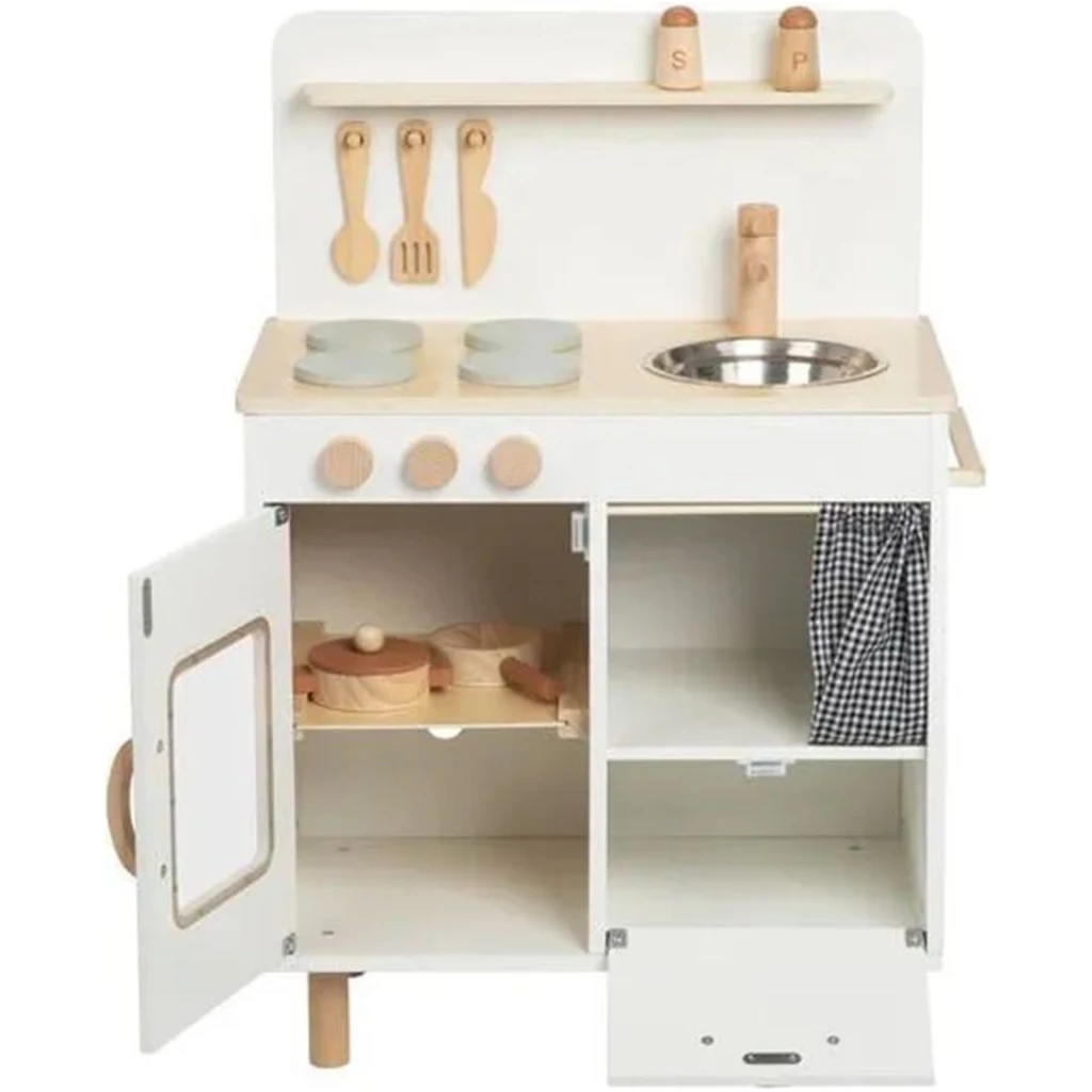 Drvena kuhinja s prirodnim drvenim izgledom za djecu Uključuje 8 dijelova drvenog pribora i funkcionalne elemente Potiče socijalne vještine kroz igru kuhanja Izrađena od kvalitetnog i održivog drva Sigurna za djecu, premazana netoksičnim bojama i lakom Idealna igracka za poklon djeci na rođendanu visina 73cm x širina 52cm x dubina 32,5cm